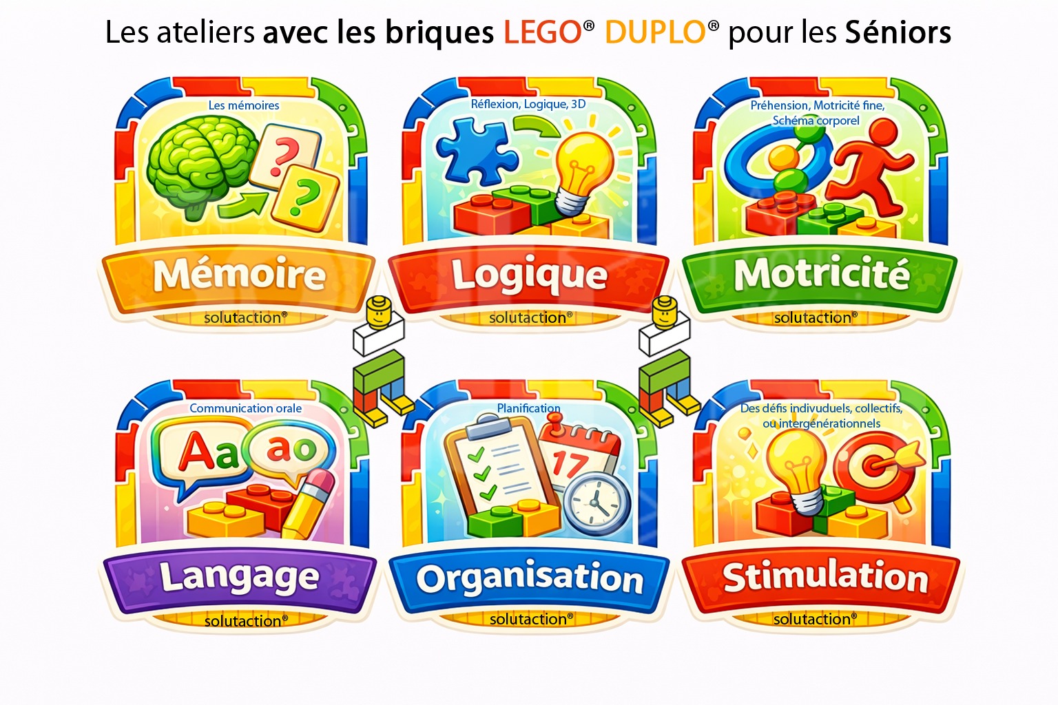 Solutaction accompagne les structures accueillant des personnes âgées dans la mise en place d’actions de stimulation globale, favorisant le maintien des fonctions cognitives, exécutives, motrices et sociales. Les dispositifs proposés s’inscrivent dans une approche non médicamenteuse, structurée, adaptée aux capacités des participants et intégrée aux projets d’établissement. Les ateliers de stimulation cognitive motrice et sociale Sénior se font essentiellement avec des briques LEGO® DUPLO®.