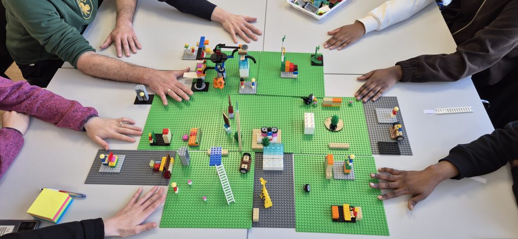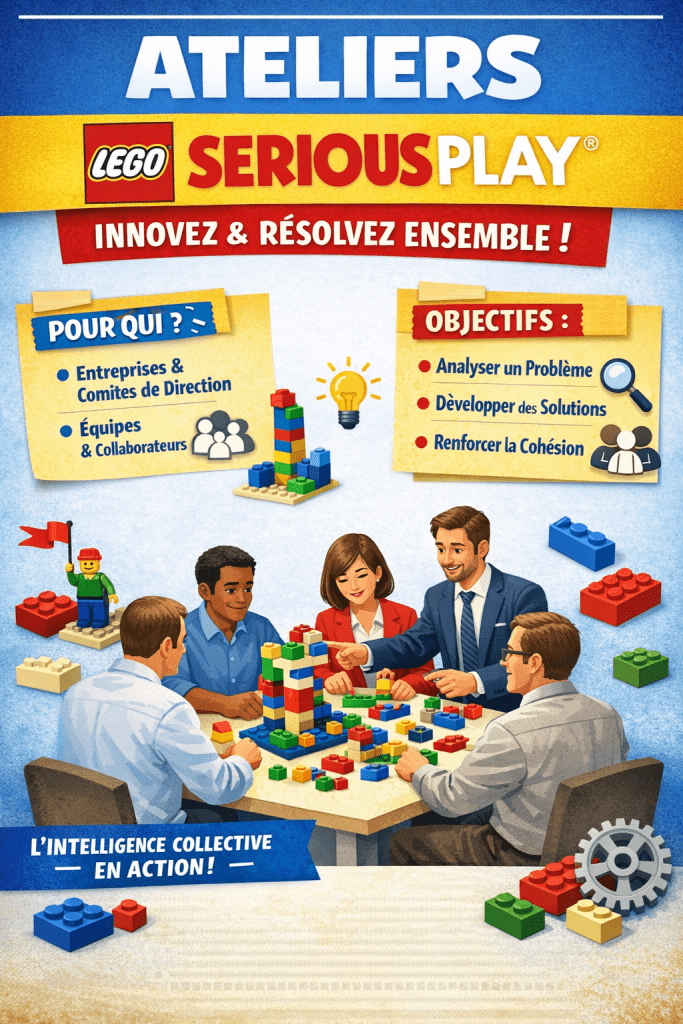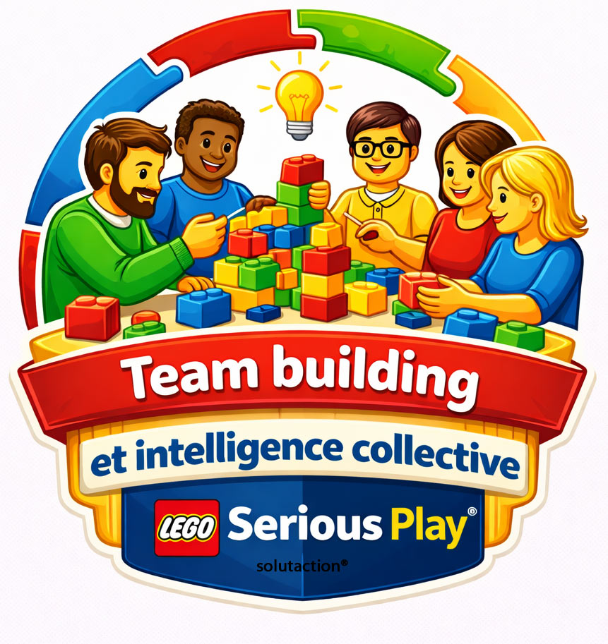 Dans les entreprises, Solutaction intervient pour faciliter la résolution de problèmes par l’intelligence collective, renforcer la cohésion d’équipe et accompagner les phases de changement. Les ateliers de team building, d’innovation ou d’intégration s’appuient sur les briques LEGO® DUPLO® pour rendre visibles les idées, fluidifier les échanges et favoriser l’implication de tous les collaborateurs. Les photos montrent des équipes engagées, concentrées et créatives, partageant une expérience collective porteuse de sens.