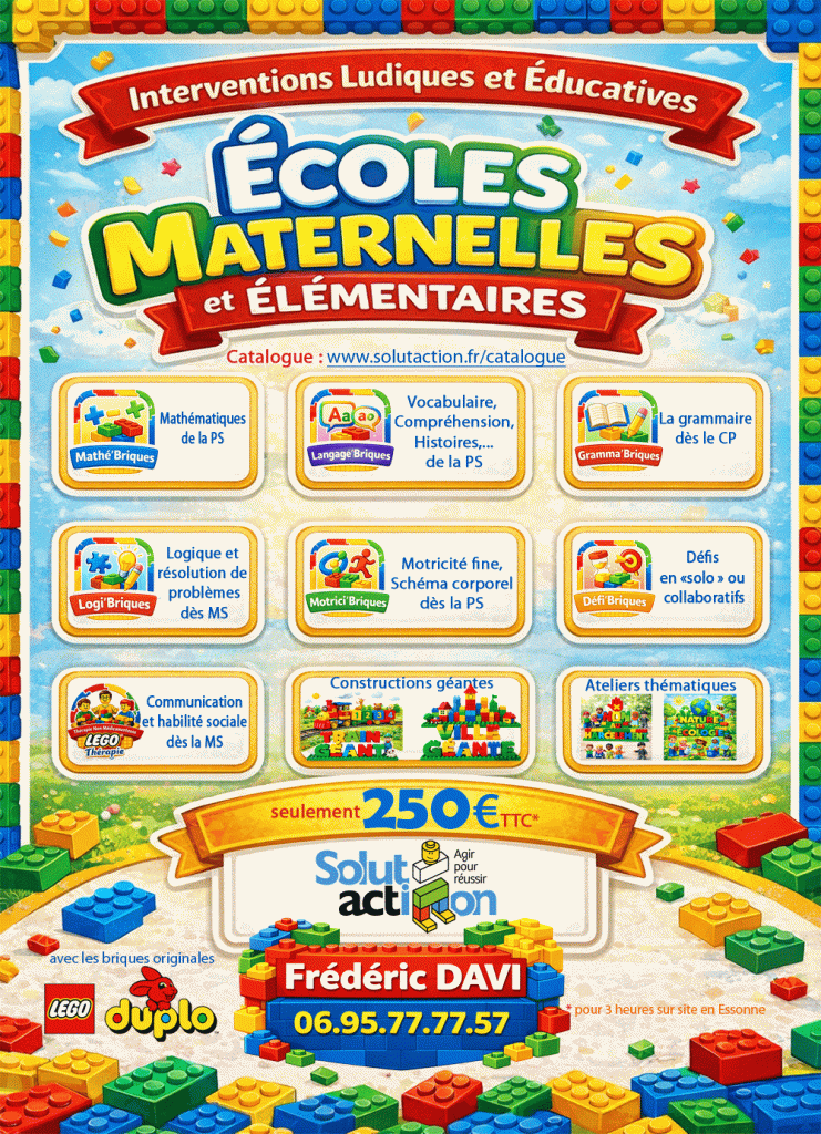 Les Sudoku en briques DUPLO®Motricité fine avec DUPLOConstruction SIX BRICKS suite à un atelier LEGO® Thérapie dans une écoleHalloween en briques LEGO®KAPLA intergénérationLes ateliers Solutacion® en école maternelles et élémentairesFaites de vos différences, vos forces de demain avec des briques LEGO DUPLO entre les mainsLes chiffres, leur représentation et LEGO BRAILLELes animaux LEGO DUPLOLes soustractions avec LEGO DUPLOLa symétrie axiale avec les briquesLEGO® SERIOUS PLAY®Le Père Noël à la téléAtelier pour entreprises avec LEGO SERIOUS PLAYLes animaux DUPLOOn aime les briques LEGO DUPLOManipuler les briques autrement qu’avec les mainsAtelier briques LEGO DUPLO pour tousLa tour infernale en DUPLO pour Sénior+100 kits SIX BRICKS en DUPLOLa représentation du nombre avec les briques LEGO®Défis individuels ou collaboratifsPartage et collaborationDévelopper le langage grâce aux LEGO DUPLODes ateliers en briques LEGO DUPLO pour tous dès 3 ansAtelier en école maternelleLa LEGO THERAPIE pour tous, dès 3 ans !Les 4 rôles dans la LEGO® ThérapieUne mallette d’activité Solutaction®Une stalactite en briques DUPLOLa représentation du chiffreLes couleurs et les formesConstruction d’une ville en mathématiques (addition)Jeu de plateau avec briques DUPLOLa représentation du nombre en briques DUPLOAtelier en entreprise / Team BuildingTri des briques LEGO® par couleurUn escalier en couleurs LEGO®Tri, une notion mathématiques en maternelleRemédiation pédagogique et cognitive avec les briques LEGO DUPLO5 idées d’atelier LEGO SERIOUS PLAYAtelier IntégénérationCompréhension d’une lecture par une constructionLes mathématiques avec les brriquesConstruction pour la motricité et l’organisationApprendre les lettres avec les briques LEGO®Téléphone Frédéric DAIUne histoire en briques DUPLOLa motricité fine avec les pincesCircuit en briques DUPLO®Une tour en DUPLOLes chiffres sous toutes leurs formesLOGICODE avec DUPLO SIX BRICKS®Frédéric DAVI, Fondateur de Solutaction®Atelier découverte offert *Des immeubles LEGO pour apprendre les additionsLEGO® SERIOUS PLAYAtelier pour centre de loisirsDes ateliers à animer…Une tour infernale en SIX BRICKSLe coaching orientation des adolescents en briques LEGO DUPLOUne dictée de mot autrementCoordonnées Solutaction®Atelier: Un train géant en DUPLO®Circuit de billes en briques LEGO pour travailler l’organisation et la motricitéLa représentation du nombre avec les briques DUPLODéfi SIX BRICKSLes briques en média de communicationSolutaction et KaizenLa grammaire avec les briquesLes chiffres et les lettres dans tous leurs étatsL’évolution des bonhommes LEGO® au fil du tempsLes étapes de la vie en DUPLOles phonèmes en briques LEGO DUPLOConstruction DUPLO pour séniorAffiche LEGO®Une histoire en brique LEGOLa logique dès la maternelle avec les briques Les troubles du neurodéveloppementTND avec les briques DUPLOLEGO® SERIOUS PLAY®Forme et géométrie avec les briques LEGOLes fractions sous une autre forme..Dire NON au HARCELEMENT avec les briques LEGO DUPLOCertificat LEGO THERAPIETableau double entrée avec briques DUPLOCalcul des volumes en briques LEGOComprendre les fractions grâce aux briques LEGO®Des briques LEGO BRAILLESAddition avec les briques LEGO DUPLOLes émotions en briques et en livresCoup de Boost OrientationAtelier : La nature et l’écologie avec les briques LEGO DUPLOLes fonctions des mots avec Gramma’BriquesLa ludopédagogieLes additions en briquesManipulation avec pinces en maternelle Logo Solutaction®Briques DUPLOConstruction d’un train géant DUPLOGaston la licorne et les briques émotions DUPLOLabyrinthe en LEGO®Une circuit de billes dans les mainsReprésenter les fractions sous plusieurs formes avec les briques LEGO®Animation SIX BRICKSDes ateliers pour tous : RASEDULISUn village en briques LEGO®Passer de l’image à la 3D avec les briques LEGO DUPLOLa représentation 3D avec les briques DUPLO®Défi de construction d’un pont en briquesHalloween en LEGOPourquoi LEGO® SERIOUS PLAY®La minifugure LEGO® sous plusieurs formesLes caisses de LEGO DUPLO de Solutaction®Les têtes EMOTIONS de DUPLO®Labyrinthe LEGO motricité et collaborationLEGO BRAILLE pour apprendre à écrireA vos briques, prêt… Construisezbriques DUPLO® pour tri par couleur et par formeLEGO SERIOUS PLAYJournée mondiale du LEGOLes algorithmes en DUPLO dès la maternelleLe coaching personnel en briques LEGO DUPLOLa symétrie axiale et en volumeBriques LEGO DUPLOLes casquettes SOLUTACTION®J’apprends à compter avec les briques DUPLO®Le nombre et sa représentation TNM pour SéniorEquilibre en briques DUPLOLes additions et soustractions en jouant aux LEGO®Les compétences scolaires en briquesBriques DUPLO LEGOJ’écris les chiffresAtelier SéniorLa représentation des chiffres en briquesDéfi d’un mur en SIX BRICKSDes briques et des briques LEGO DUPLOConstruction LEGO DUPLO séniorAtelier : une ville géante en DUPLO®Construire une partie d’une histoire et raconterDes briques pour tousVos différences entre les mains !La structure de la phrase avec Gramma’BriquesLes formes avec les briques DUPLOTri des briques par couleursTrain DUPLO et aiguillage Des nouvelles briques sont arrivéesLa motricité fine et le schéma corporel grâce aux briquesAnimation DUPLO PLAY AND LEARNLa LEGO THERAPIE pour les enfantsLa LEGO® ThérapieDes idées d’ateliers LEGO DUPLO pour les séniorsLes additions en briqueUne partie du stock de Solutaction®La conjugaison avec LEGO DUPLOSolutaction® en briques LEGOLes émotionsLe TOTEM DES ANIMAUX et les briques LEGO DUPLO