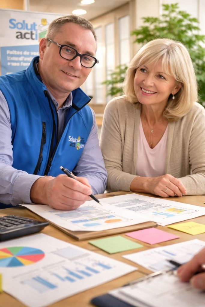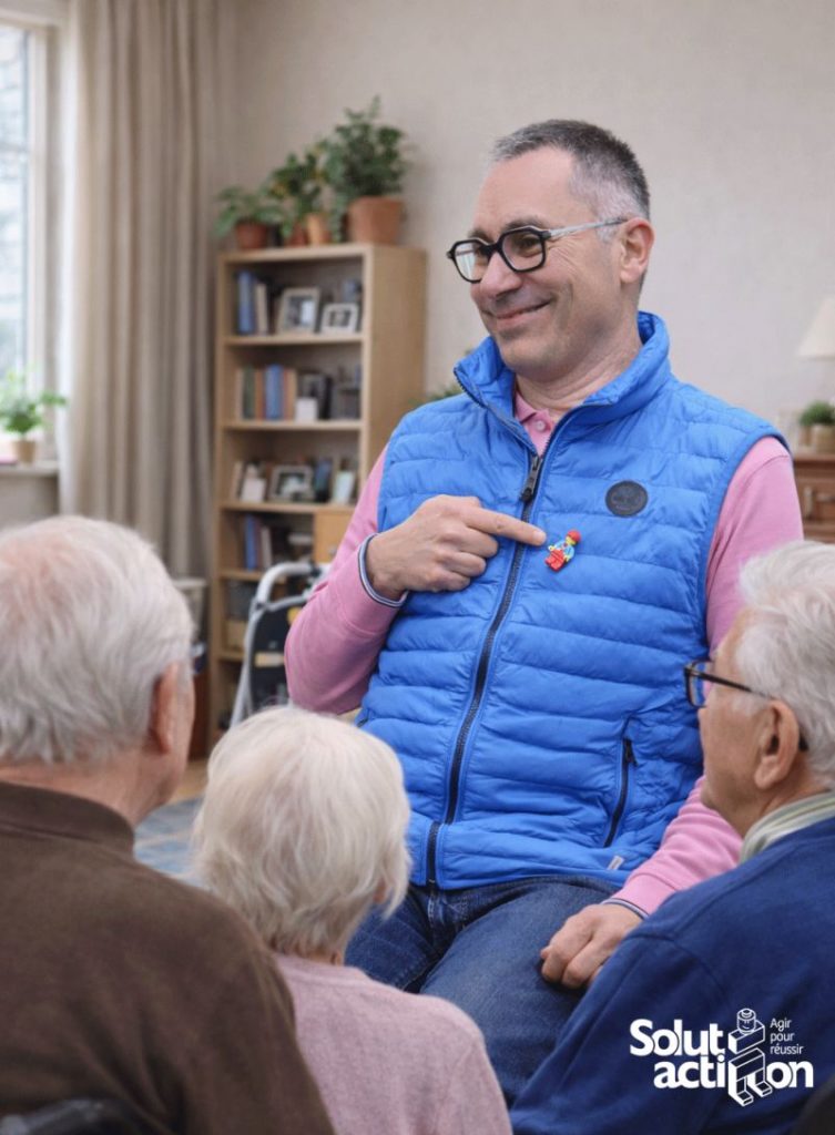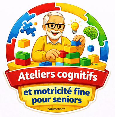 Solutaction accompagne également les adultes et les séniors, notamment dans des contextes de fragilité cognitive, de reprise de confiance ou de prévention du vieillissement cognitif. Les images illustrent des temps de réflexion, de coopération et de stimulation intellectuelle, où chacun peut s’exprimer à son rythme et selon ses capacités.