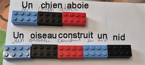 Comme dans la méthode Montessori, chaque catégorie grammaticale peut être représentée par une couleur de brique LEGO®.