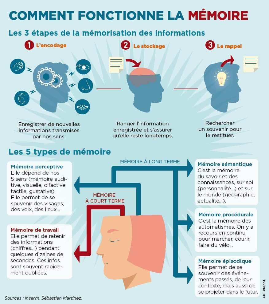 L’infographie que je vous propose met en lumière les 5 grands types de mémoire. Ces cinq formes interagissent en permanence dans notre quotidien, pour apprendre, se souvenir, raisonner et agir.