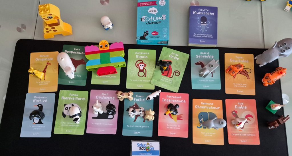 Si vous pouvez vous inspirer du jeu pour n’utiliser que les animaux. Toutefois, il est très intéressant d’associer les animaux LEGO® DUPLO® aux véritables cartes TOTEM®, ainsi vous multipliez les médias d’expression. Vous enrichissez le panel des animaux LEGO® DUPLO® et des cartes TOTEM®. Les valeurs et les phrases présentes sur les cartes élargissent le vocabulaire chez les plus jeunes et peut compléter l’association animal-valeur quel que soit l’âge des participants.